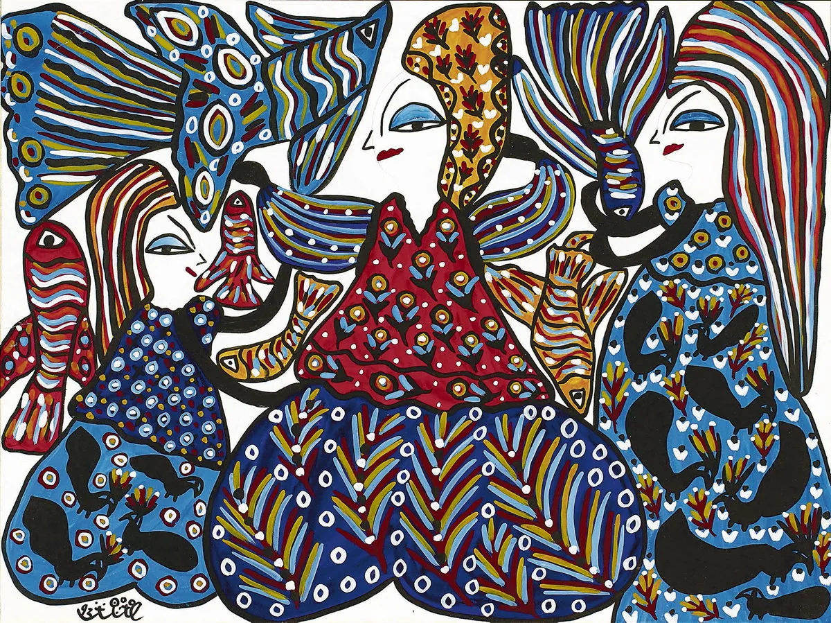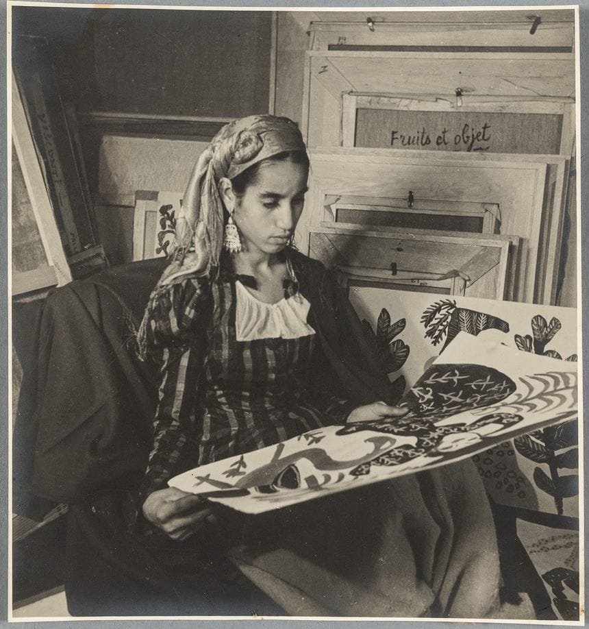 Baya (1931-1998), de son vrai nom Fatma Haddad, était une peintre algérienne autodidacte considérée comme l’une des figures pionnières de l’art moderne algérien. Orpheline à 5 ans, recueillie par Marguerite Caminat, elle fut découverte à 16 ans par le galeriste Aimé Maeght. André Breton préfaça son exposition en 1947 et elle côtoya Picasso à Vallauris. Son univers de femmes, d’oiseaux et de fleurs aux couleurs vibrantes a marqué l’art du XXe siècle.