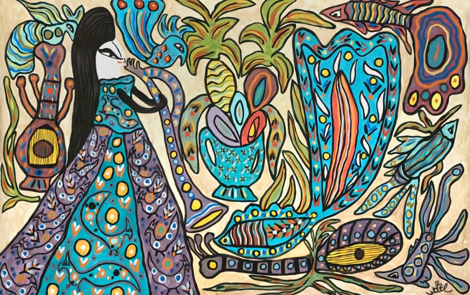 L’œuvre de Baya est un monde clos, exclusivement féminin, à la fois reclus et souverain. Ses « Hautes Dames » aux robes chatoyantes, entourées d’oiseaux multicolores, de fleurs luxuriantes et d’instruments de musique, habitent un jardin d’Éden où le temps semble suspendu.